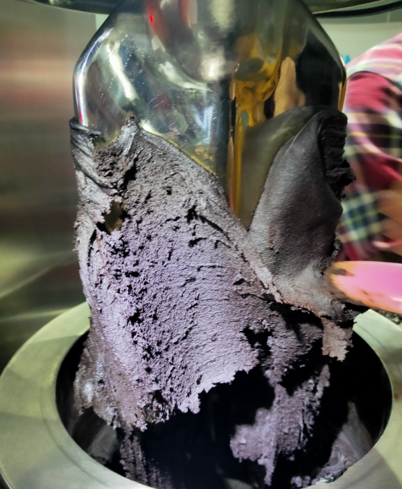 物料呈高粘度的膏體狀,第一代就是靠人工棒打,截至目前更新代換也是先用密煉機(jī)攪拌,攪拌之后在用壓面機(jī)來(lái)回碾壓。立式捏合機(jī)的捏合功能剛好代替兩種,經(jīng)過(guò)捏合實(shí)驗(yàn),客戶成型的產(chǎn)品效果相當(dāng)好。如此粘度之高的物料,擠壓出料干凈幾乎無(wú)殘留讓客戶甚是滿意,生產(chǎn)直接提高60%效率。